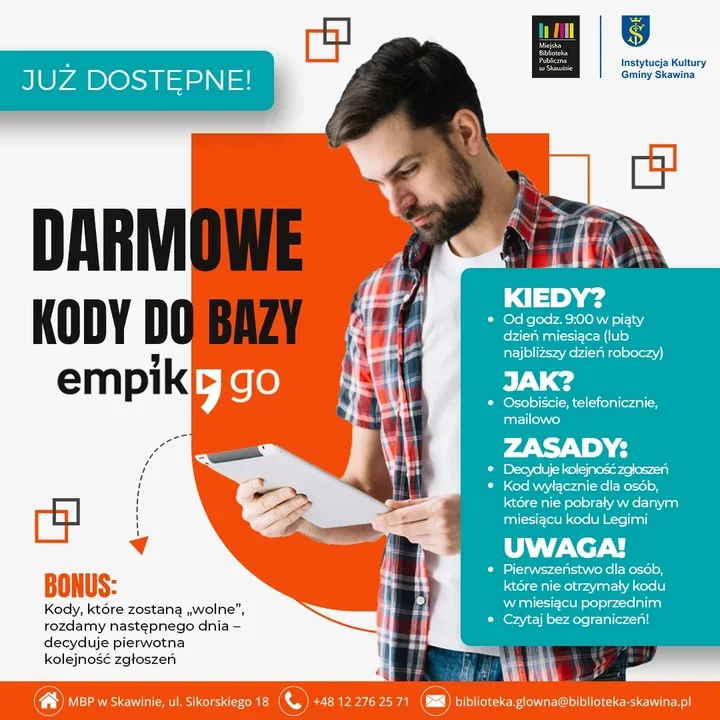 Miejska Biblioteka Publiczna w Skawinie udostępnia bezpłatne kody na platformę EmpikGo, które pozwalają korzystać z bazy około 32 000 ebooków, 6 000 audiobooków i 12 000 podcastów 😊. Warunki są proste, ale warto je znać - dzięki temu wiadomo, kto ma pierwszeństwo i kiedy zgłaszać się po kod.