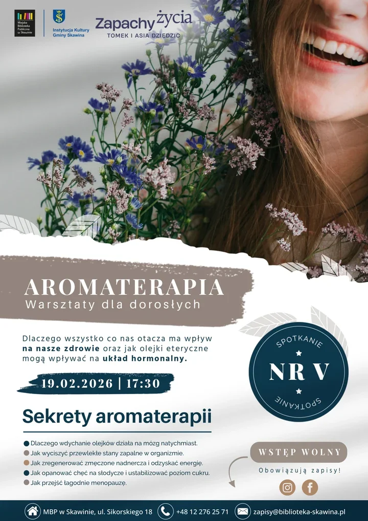 Piąte spotkanie cyklu prowadzonego przez duet „Zapachy życia” - Asia i Tomek Dziedzic - skupia się na tym, jak olejki eteryczne wpływają na organizm i hormony oraz jak wykorzystać aromaterapię w codziennej regeneracji. Organizatorzy zapowiadają porcję praktycznych wskazówek i prostych rozwiązań dla osób dorosłych, które chcą poprawić samopoczucie naturalnymi metodami 🙂🌿.